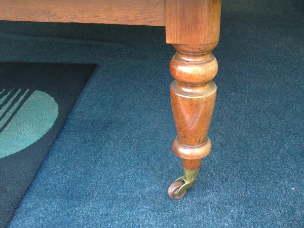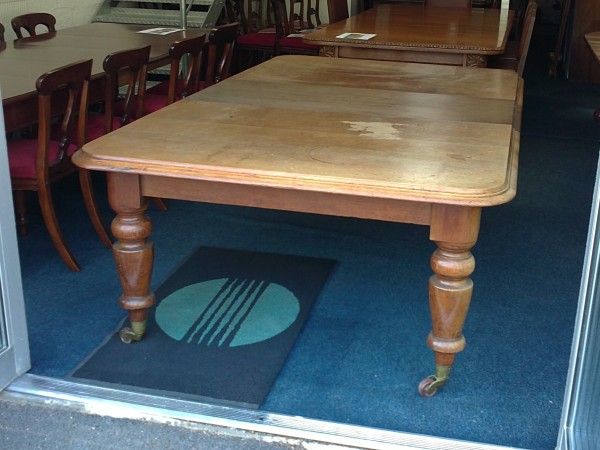A large Victorian oak wind out dining table to seat 12 to 14 people, standing on turned legs with castors. Shown prior to polishing (choose your own shade and finish). Measures 330cm long (130 inches) x 135cm wide (53 inches).
