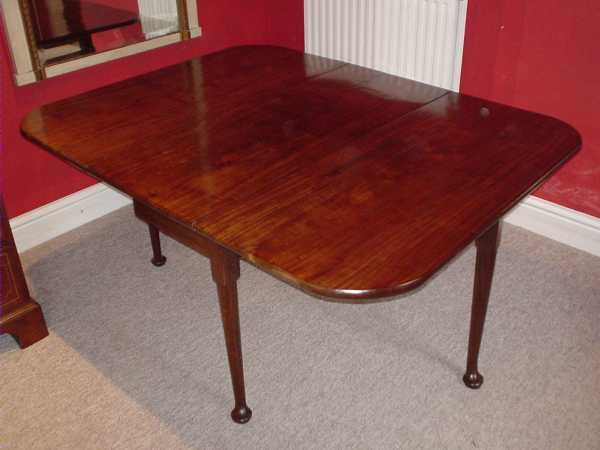 An 18th century Cuban mahogany drop leaf dining table on pad feet.