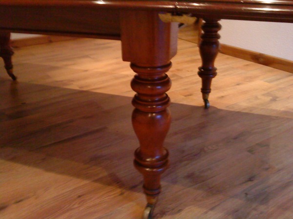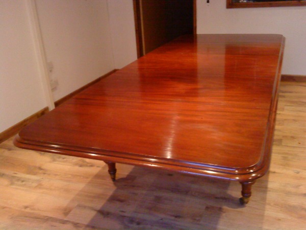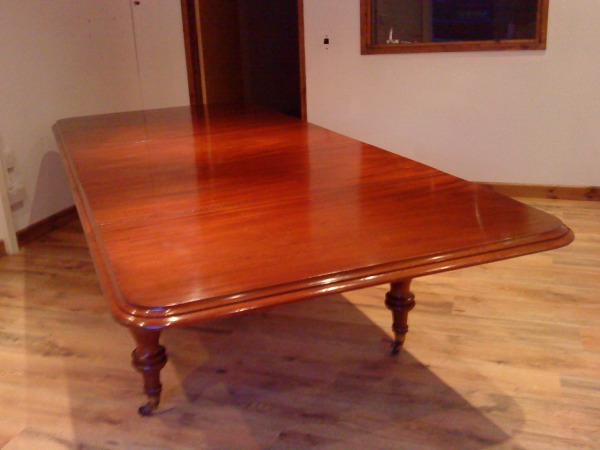 A fine early Victorian pull out mahogany dining table standing on turned baluster legs with 3 extra leaves to comfortably seat 12 people, 120 inches long (10 feet), 50 inches wide and 29 inches high. In beautifully restored condition with nicely figured timbers.