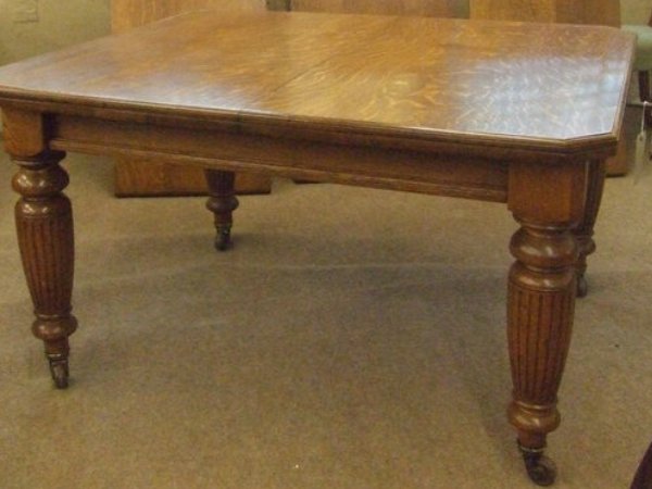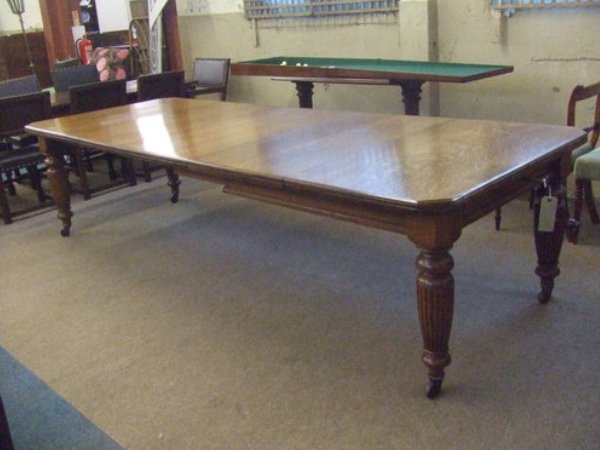 A Victorian oak wind out dining table with 3 extra leaves to comfortably seat 12 people, 122 inches long (10 feet and 2 inches), 52 inches wide and 29.5 inches high.