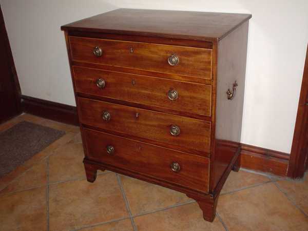 A late Georgian mahogany chest of drawers, c1820, of beautiful small proportions, 29.5" high by 25" wide, with brass ring handles on drawer fronts and swan neck lifting handles on chest sides. Standing on bracket feet.