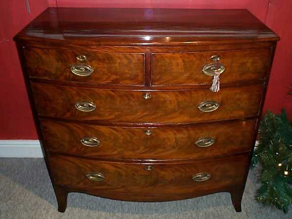 A George III mahogany bow front chest of drawers, c1800, with splay feet and beautifully figured veneers, 41.5" wide by 41" high.