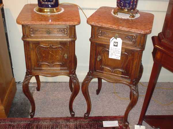 An attractive pair of French oak bedside cabinets standing on cabriole legs with marble tops, Circa 1920.