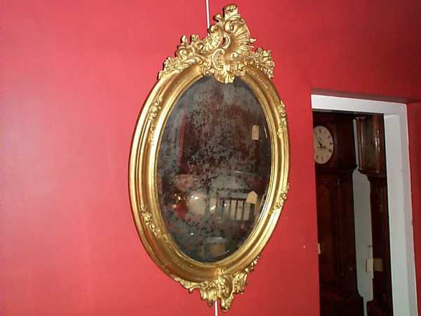 A very pretty mid 19th century French oval gilt mirror, 39" high by 24" wide, decorated with foliate crest, having original bevelled glass.