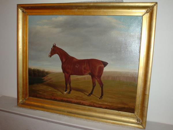 'Bay hunter in a meadow' by JAMES LODER OF BATH (1784-1860), a finely painted oil on canvas in very good original unlined condition, recently subject to a very light cleaning. James Loder was a prolific sporting painter who lived and worked in Bath at the end of the Georgian and into the Victorian era, though his style is firmly rooted in the earlier period. He frequented numerous racecourses in the south-west of England and south Wales. His work shows a lively awareness of human and equine characterisation. He was the father of Edwin Loder, also a sporting painter. The painting is signed and dated (1838) bottom right, size 75 x 57cm.