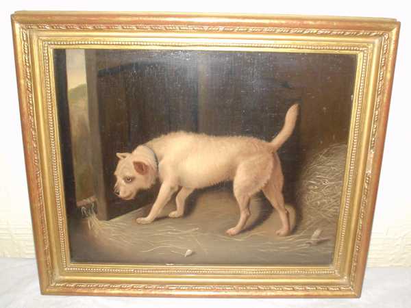 A well executed Victorian oil on board of a white long haired Terrier looking to the stable door with a clay pipe in the foreground. Dimensions 32cm x 36cm overall.