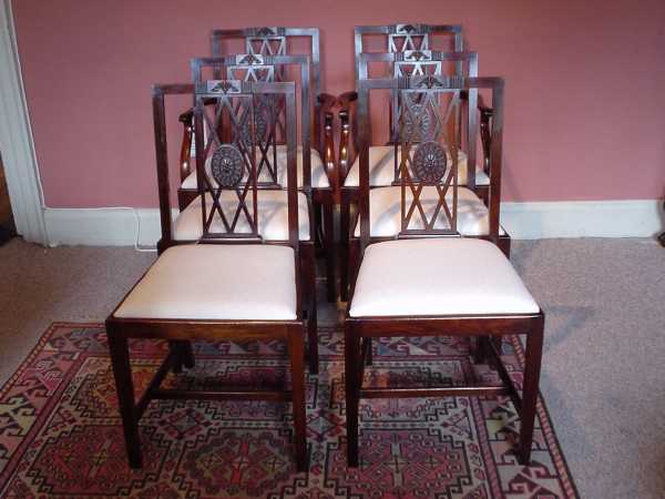 Set of six Edwardian carved mahogany dining chairs of good colour with drop in seats, two carvers and four side chairs, c1910.