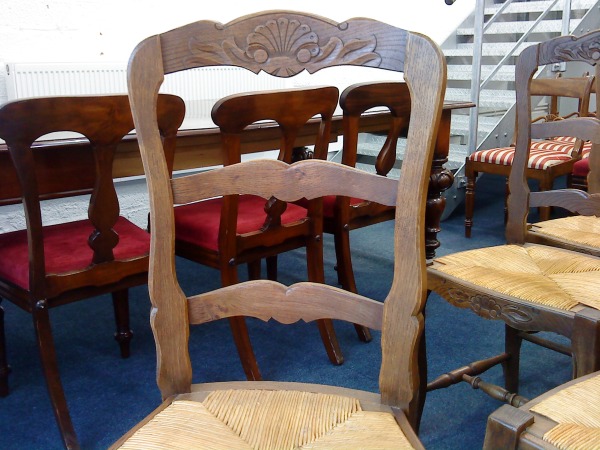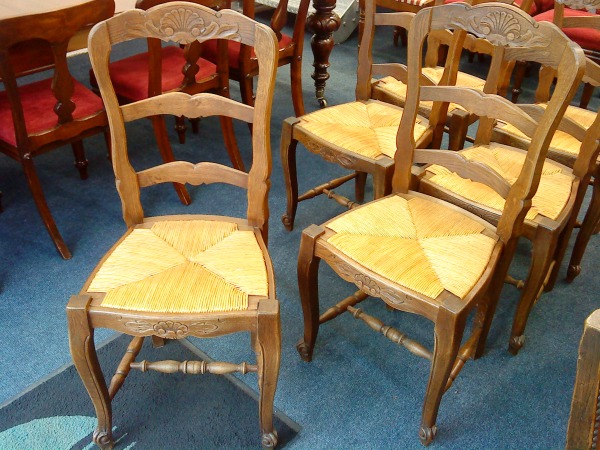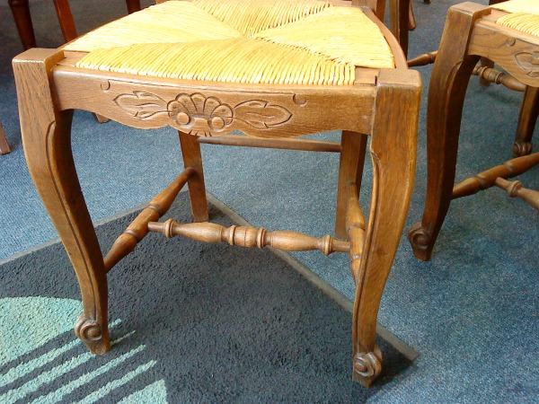 An attractive set of 6 mid 20th Century French oak cafe chairs with drop in rush seats and cabriole front legs. Chair height 39 inches, seat height 18 inches and seat width 17.5 inches.