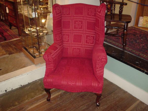 A late Victorian wingback armchair with cabriole front legs, standing on the original china castors. Good example, c1890.