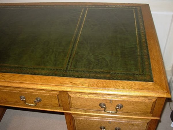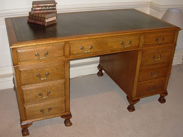 A beautifully restored 1920's oak pedestal desk with green leather inset on ball and claw feet with key, all drawer locks working. Dimensions: 136cm (53.5 inches) wide x 76cm (30 inches) deep x 77cm (30.3 inches) high.