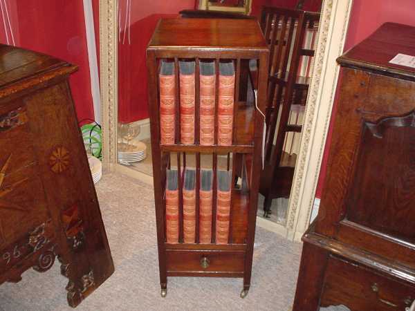 Late Georgian mahogany double canterbury of good colour with two tiers supported by reeded columns over a single drawer, c1825.