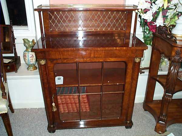 A very pretty Regency amboyna chiffonier, c1825, with glazed door flanked by pillars decorated with original brass mounts.